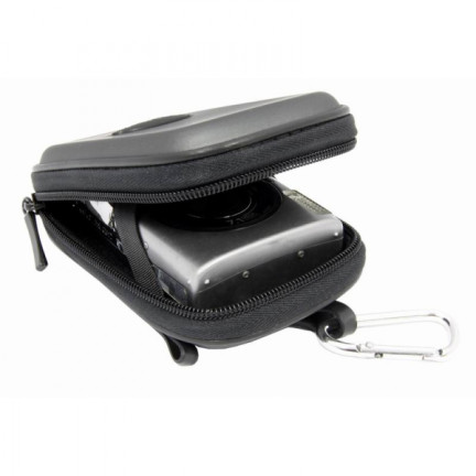 Malé, velmi praktické pouzdro pro kompaktní fotoaparát. Skvěle chrání před nárazy, tlumí nárazy a chrání fotoaparát před vlhkostí. Vyrobeno z odolného a vysoce pružného plastu. Na zadní straně má rukojeť pro připevnění k opasku kalhot. Součástí je ramenní popruh s kovovými karabinami.