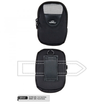 Malé, velmi praktické pouzdro na kompaktní fotoaparát. Měkké stěny se skvěle přizpůsobí tvaru fotoaparátu a chrání jej před nárazy, tlumí nárazy a chrání fotoaparát před vlhkostí. Uvnitř je malá síťovaná kapsa na paměťové karty. Na zadní straně má úchyt pro připevnění na opasek kalhot. Na přední straně je malá kapsa na další příslušenství. Součástí balení je ramenní popruh, který se připevňuje pomocí kovových karabinek.