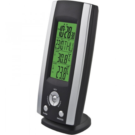 Moderní meteorologická stanice s velkým, snadno čitelným displejem. Zobrazované informace: čas, datum, den v týdnu, venkovní teplota, vnitřní teplota. Obsahuje vestavěný budík s funkcí odložení. Součástí je bezdrátový externí senzor se zobrazením teploty.